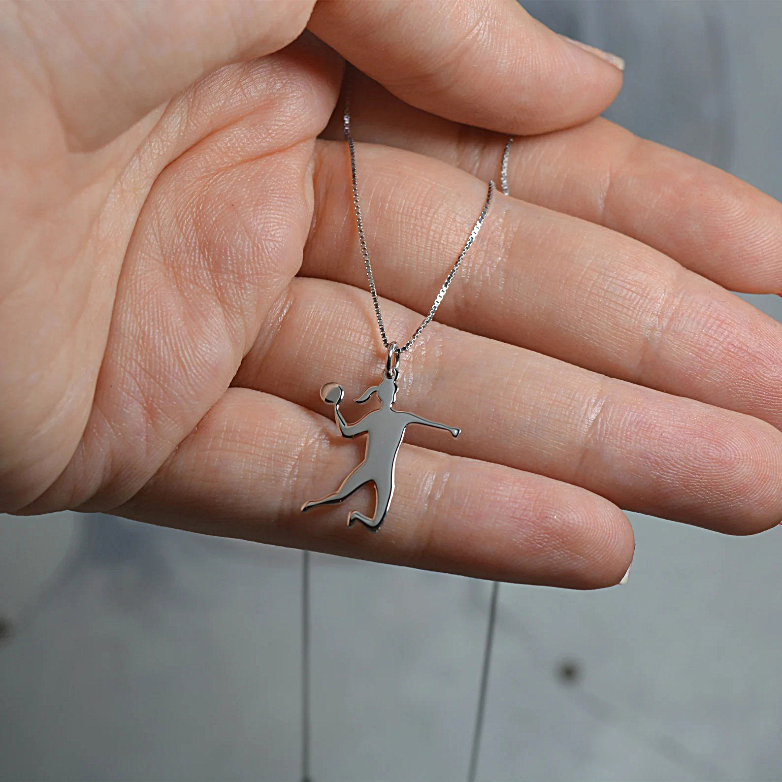 Ένα κολιεδάκι για τους φαν του handball. Μία όμορφη φιγούρα χαντμπολίστριας γεμάτη χάρη και κίνηση. Ένα κοσμηματάκι ευκολοφόρετο και διακριτικό που σίγουρα δεν θα περάσει απαρατήρητο. Διατίθεται σε δύο χρωματισμούς, λαμπερό λευκό επιπλατίνωμα και κλασικό κίτρινο επιχρύσωμα. Η επιλογή δική σας!!!