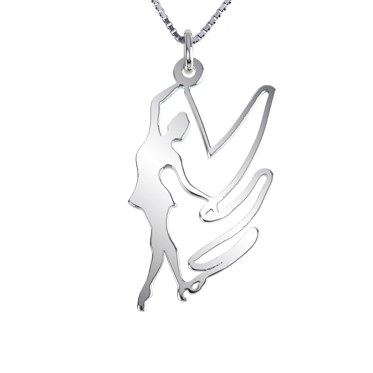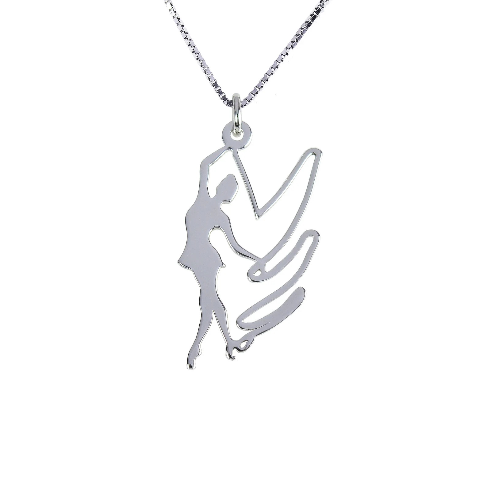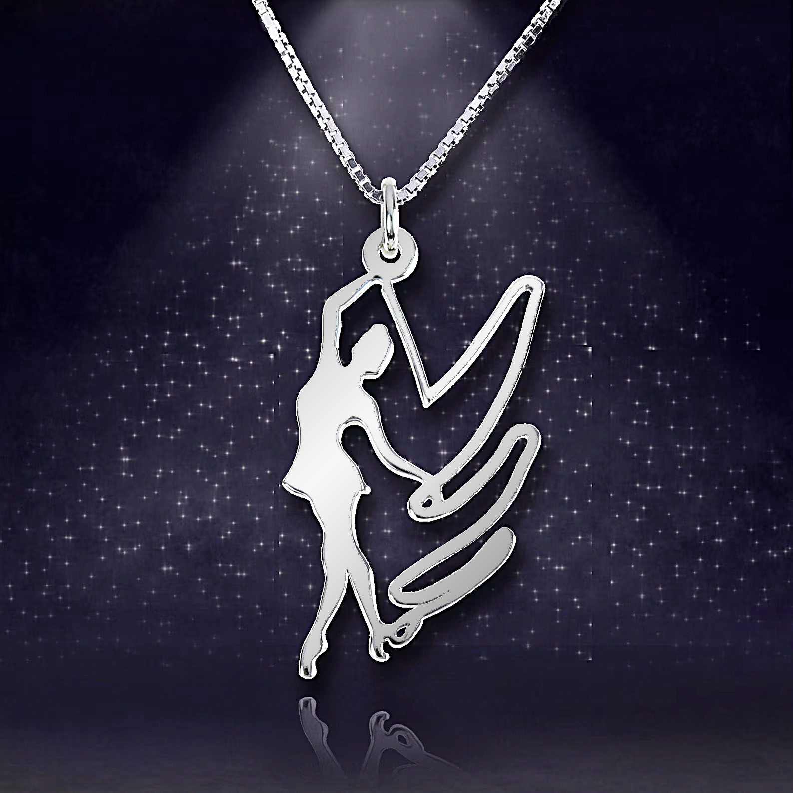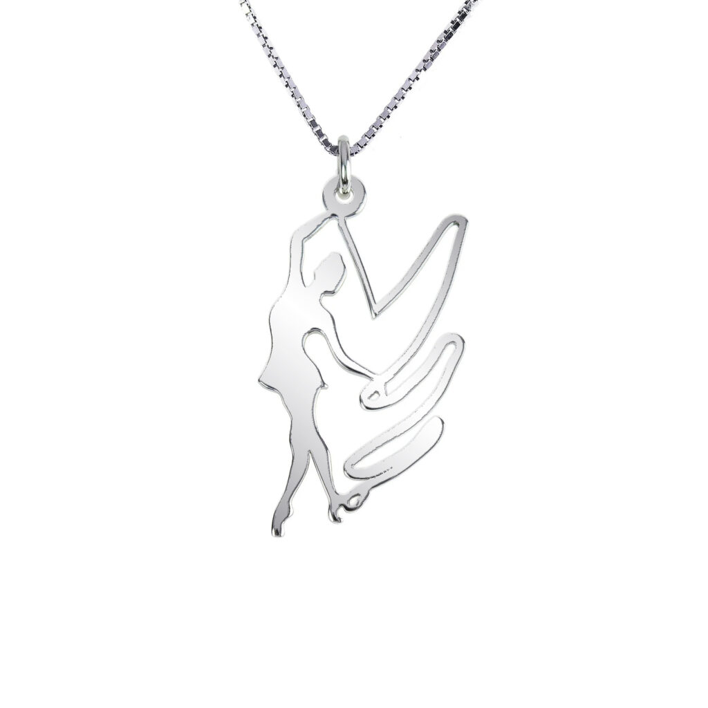 Ένα άθλημα που απαιτεί ισσοροπία δύναμη και αντοχή, απεικονίζεται αρμονικά σε αυτό το υπέροχο μενταγιόν. Ασημένιο μενταγιόν με φιγούρα κοπέλας να κάνει κορδέλα ρυθμικής γυμναστικής.