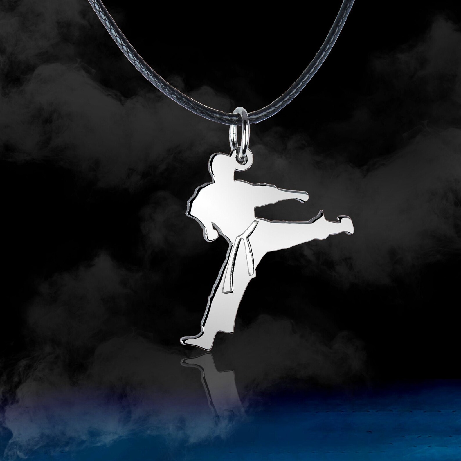 Κόσμημα που θα φορεθεί από εκείνους που θέλουν να ξεχωρίσουν. Ασημένιο μενταγιόν με φιγούρα αθλητή Karate να εκτελεί πλάγια κλωτσιά.