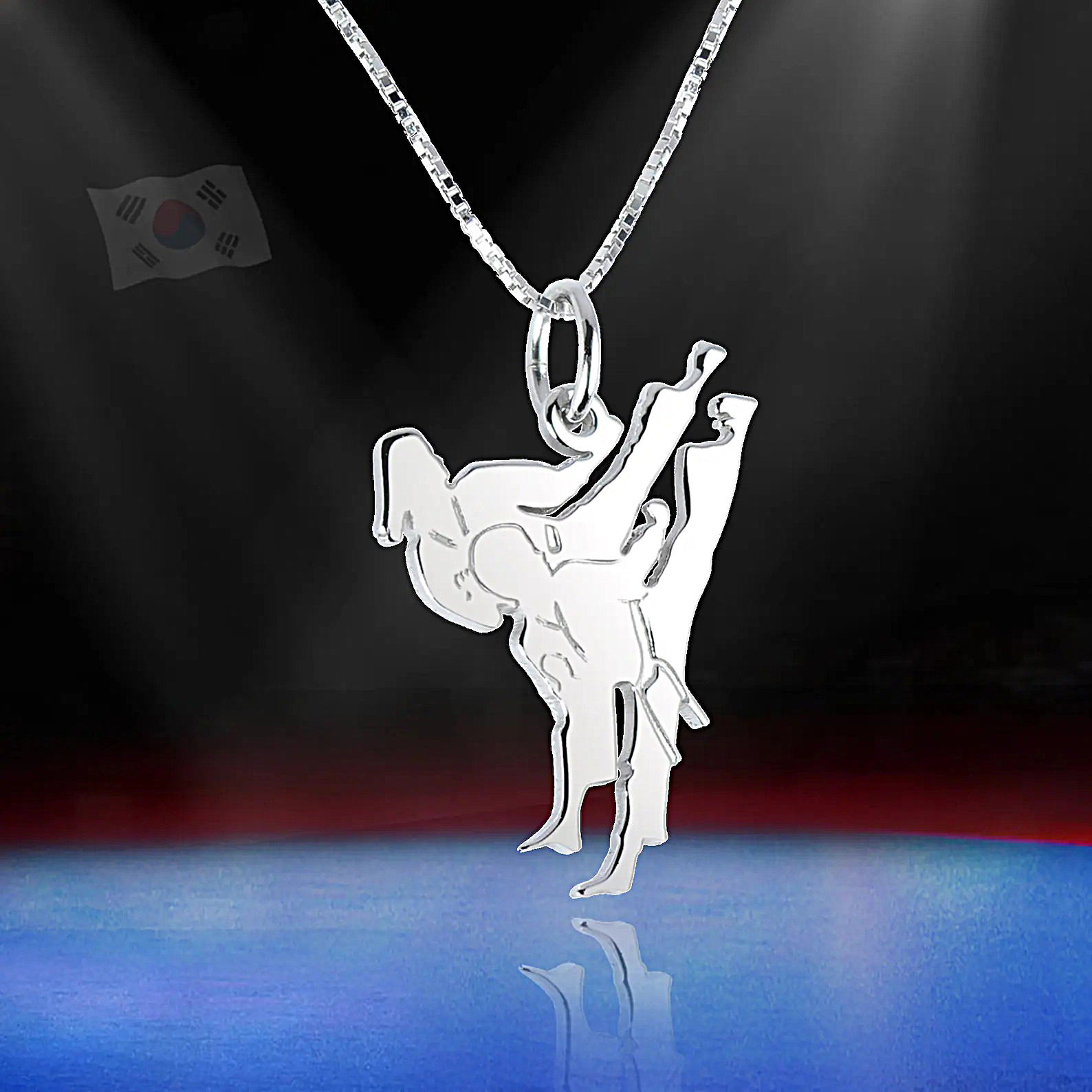 Ασημένιο μενταγιόν με φιγούρα μητέρας και γιού κάνοντας προπόνηση Taekwondo TWD02