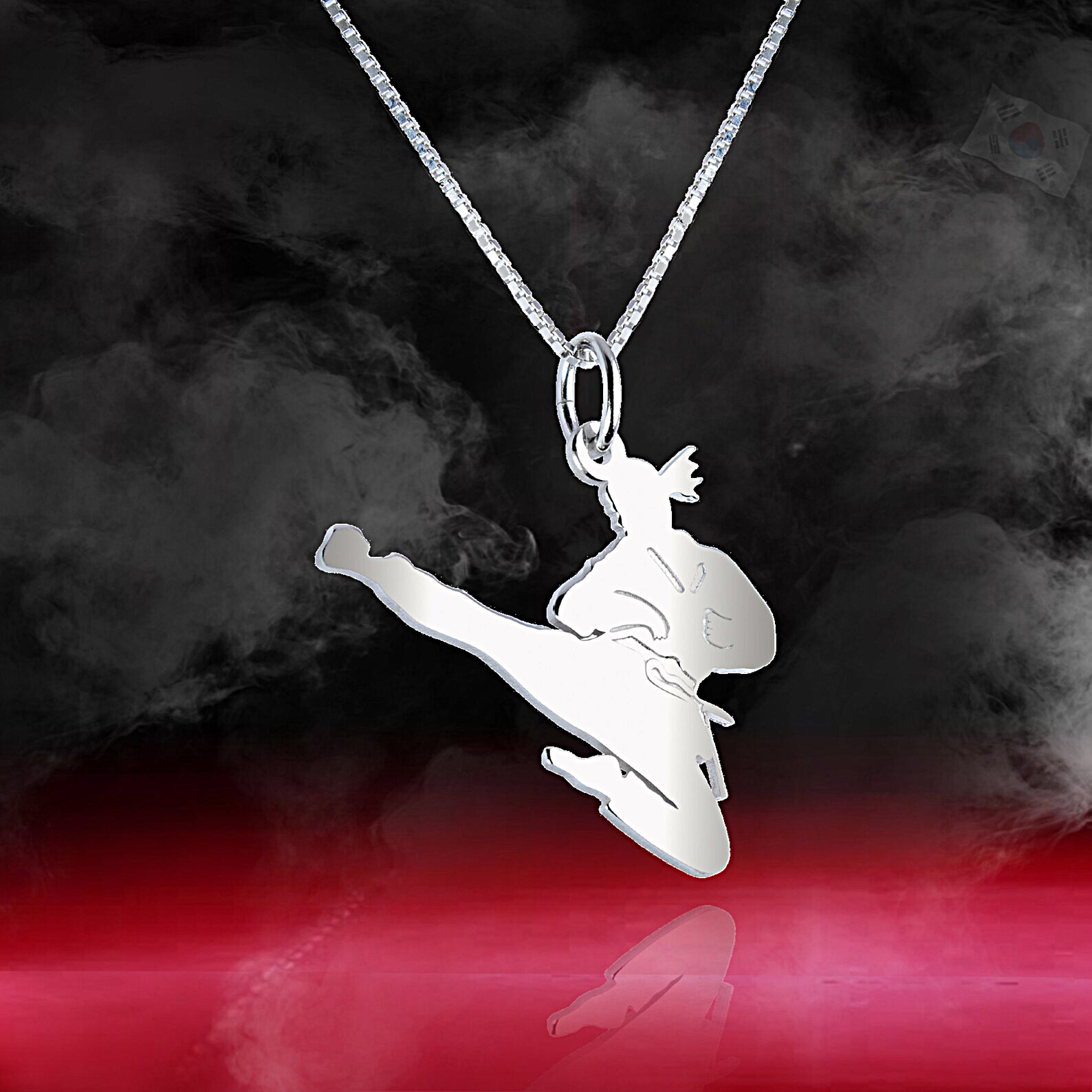 Ιδιαίτερη επιλογή για τις γυναίκες που αγαπούν το Taekwondo. Ασημένιο μενταγιόν με αθλήτρια του Taekwondo να εκτελεί πλάγια κλωτσιά στον αέρα. Δυναμισμός και ενέργεια σε ένα μοναδικά σχεδιασμένο κόσμημα!