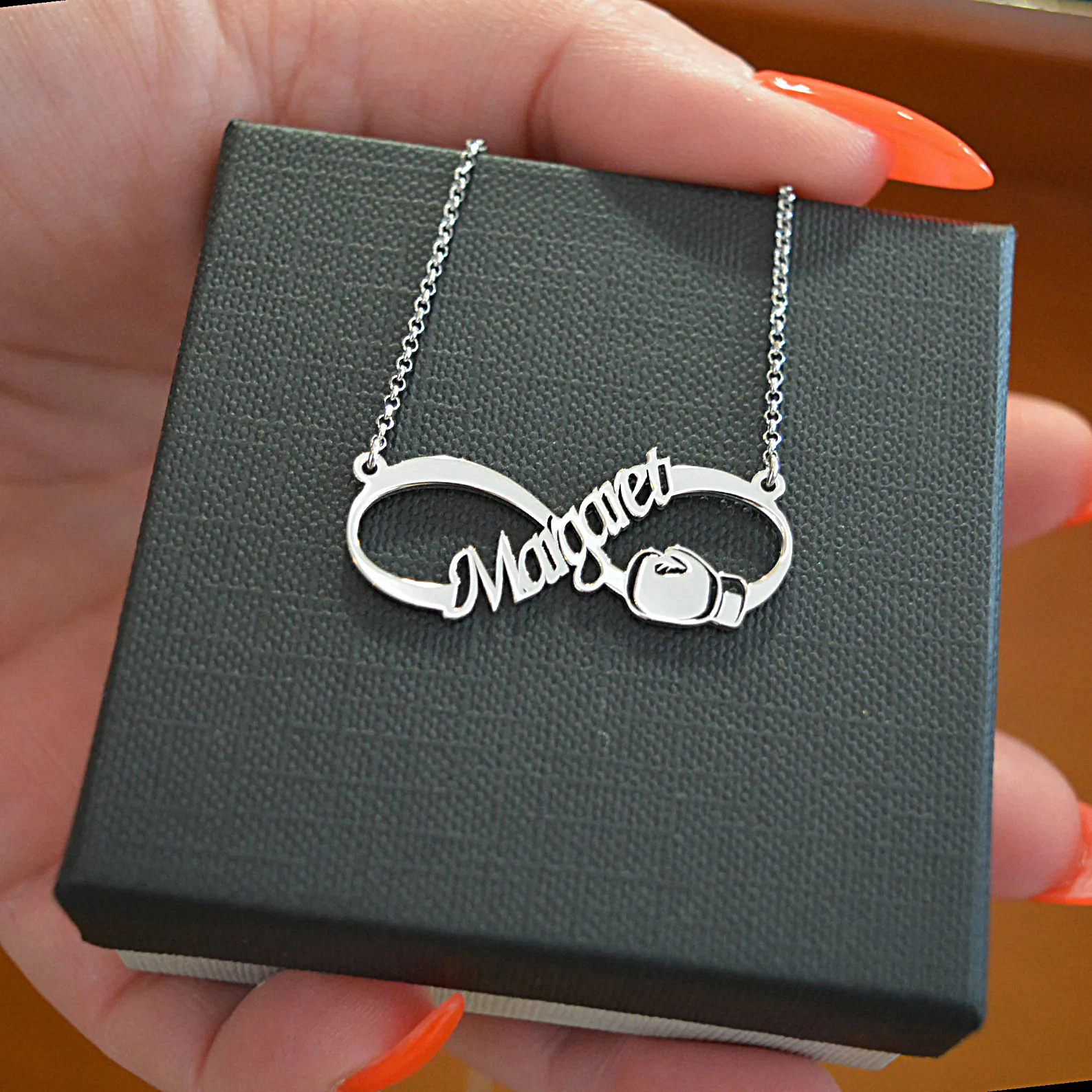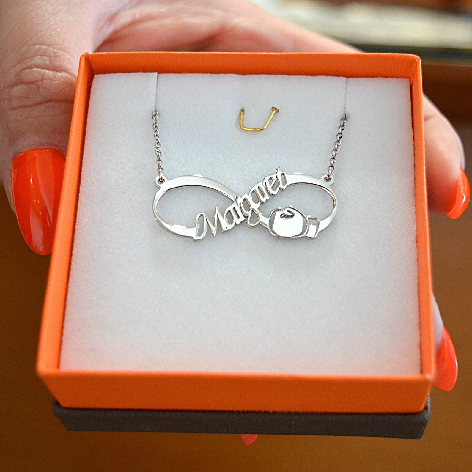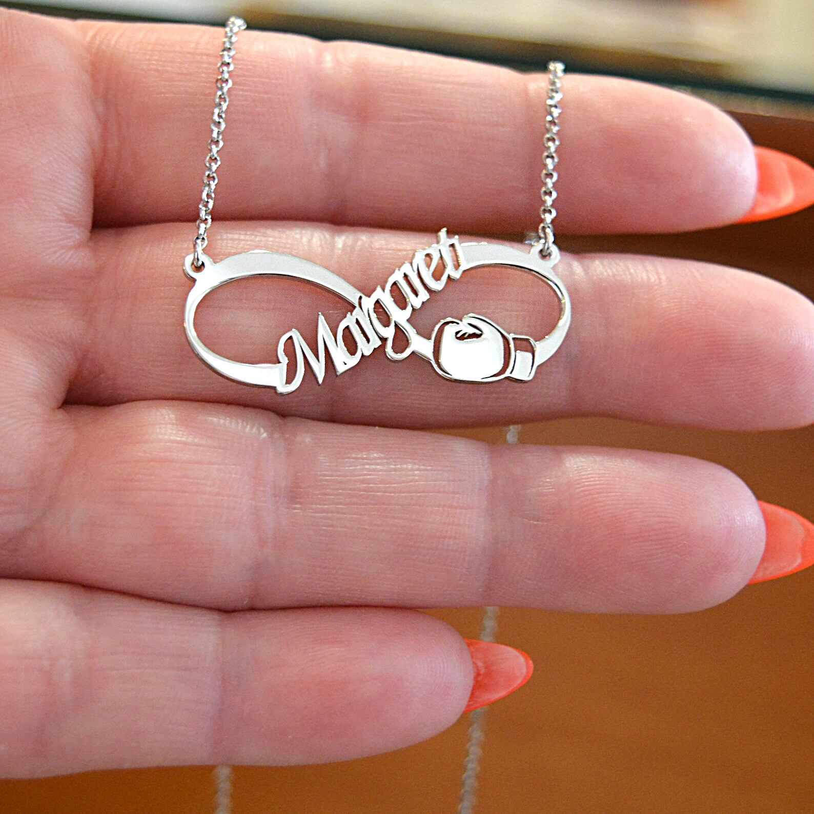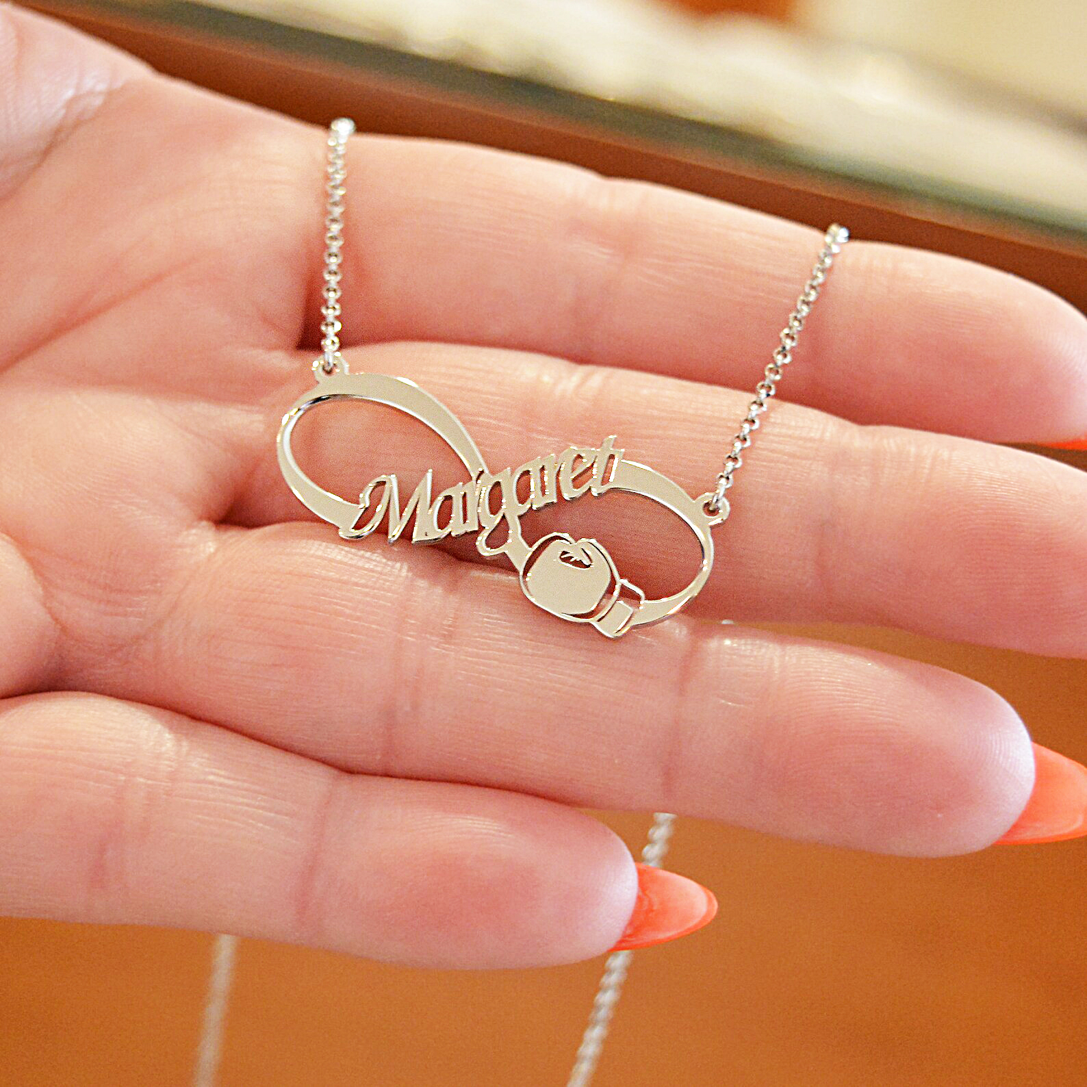 Όταν η αγάπη σου για το Box αγγίζει το άπειρο! Μοναδικού σχεδιασμού κόσμημα εμπνευσμένο από το άθλημα του Boxing! Ασημένιο προσωποποιημένο κολιέ με το σχήμα του απείρου και γάντι του Box.