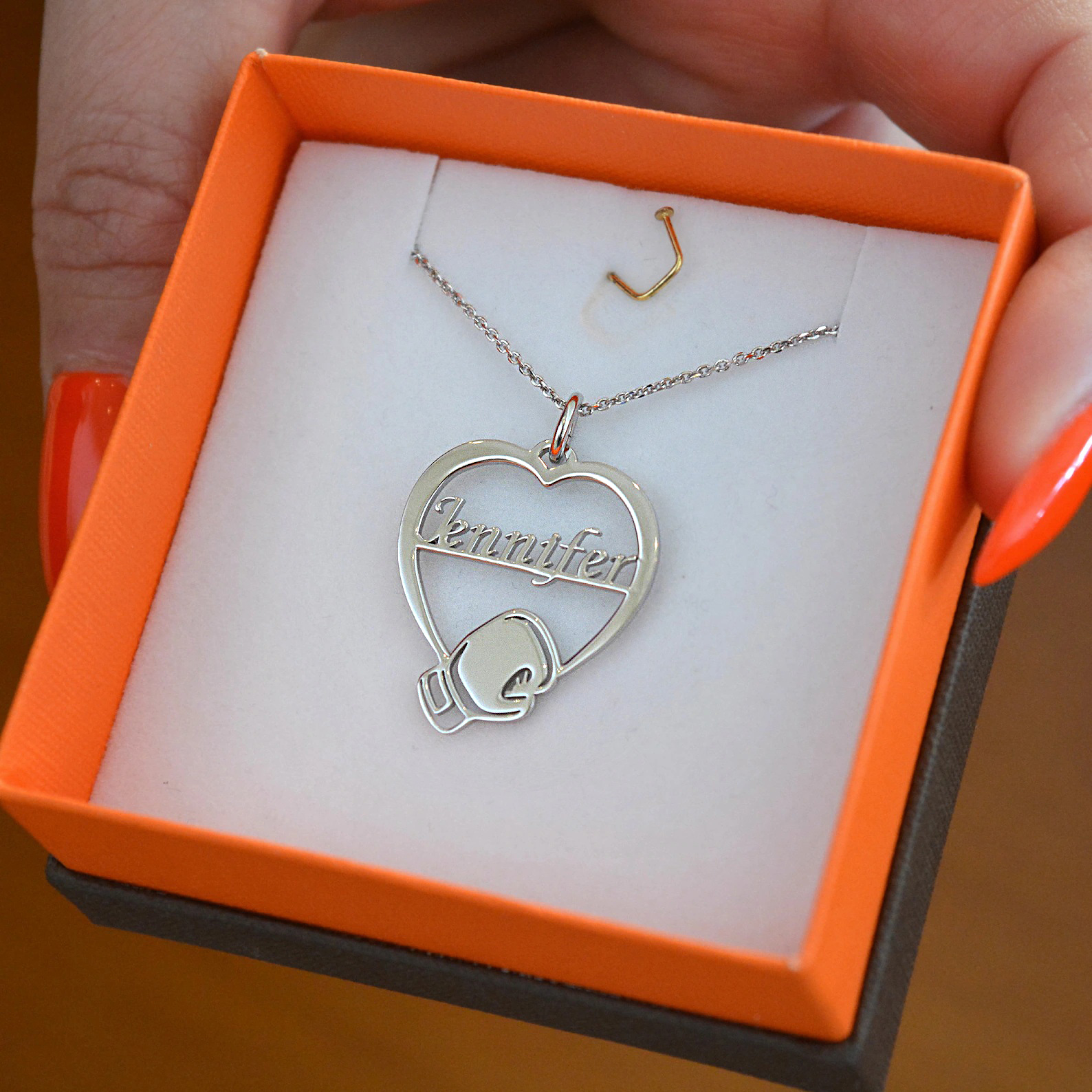 Ένα ιδιαίτερο δώρο που θα εκτιμήσει κάθε αθλήτρια της Πυγμαχίας.  Ασημένιο μενταγιόν καρδιά με γάντι μποξ. Γυναικείο κολιέ με όνομα από ασήμι925.