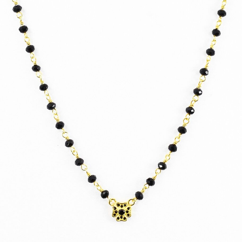 Ασημένιο κολιέ επιχρυσωμένο με ροζάριο όνυχα δεμένο με κεντρικό στοιχείο τετράφυλλο τριφύλι με μαύρα ζιργκόν.